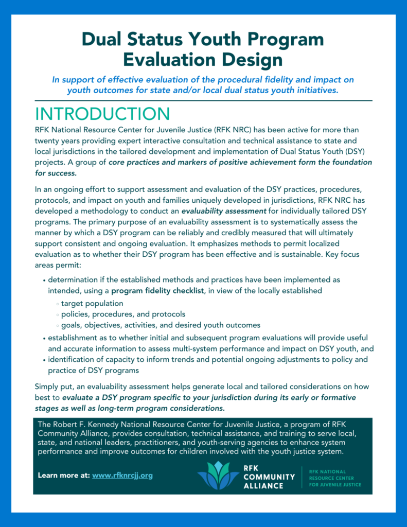 The Dual Status Youth Program Evaluation Design is a concise, 3-page guide for conducting an evaluability assessment of Dual Status Youth (DSY) programs. This resource offers jurisdictions a straightforward 4-step blueprint to evaluate the implementation and impact of their DSY practices, ensuring their programs are both effective and sustainable. Key focus areas include assessing program fidelity, evaluating outcomes, and providing long-term capacity for ongoing evaluation.