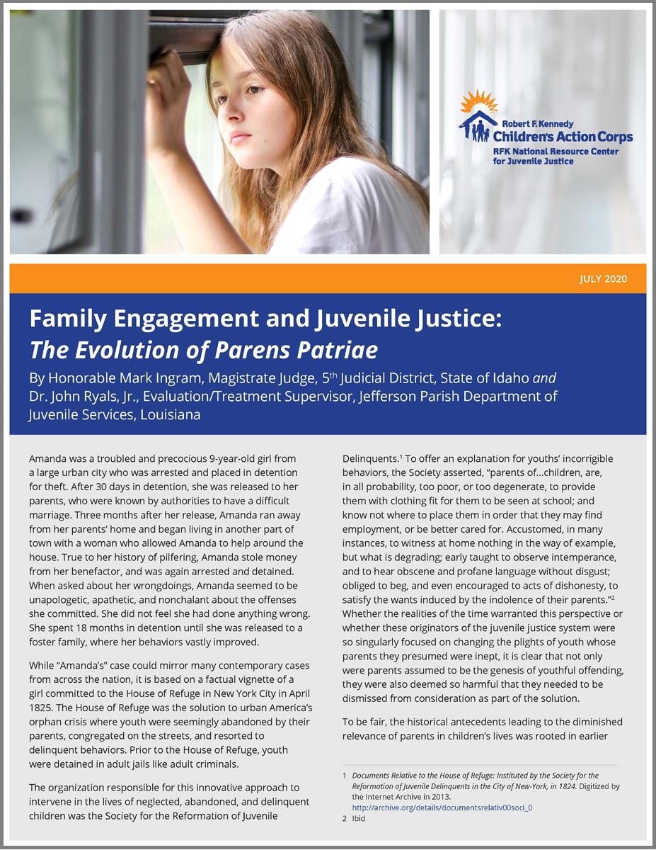 Throughout the history of the juvenile justice system, consideration has been given to how parents and caretakers should—or should not—be involved in addressing the short- and long-term needs of children in the system. Family Engagement and Juvenile Justice: The Evolution of Parens Patriae takes a reflective look at systems’ engagement with families and the shifting perception of parent and caretaker involvement—which continues to recognize that parents and caretakers play an integral role in effectively serving youth and the community. This brief describes the continuum of “family voice” and “system voice” decision making approaches and the inherent impact on youth outcomes, including recidivism. The authors also highlight practices and approaches that improve interactions and effectively engage families, such as Motivational Interviewing and Family Group Decision Making case planning. The brief articulates the substantial need to not view family engagement as simply one “part” of a case plan, but rather integrate policies and practices that place families at the center of the service delivery spectrum.