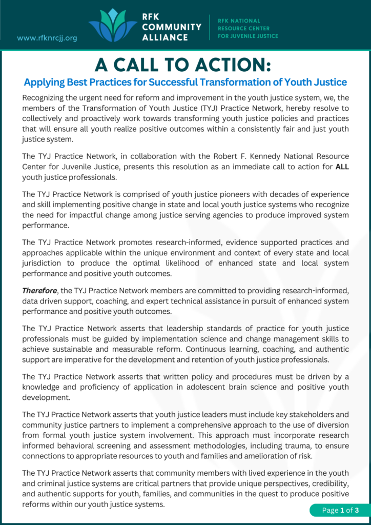 The TYJ Practice Network is pleased to present “A Call to Action: Applying Best Practices for Successful Transformation of Youth Justice” (Call to Action). This resolution, endorsed by the National Resource Center, seeks to support the acceleration of adoption and implementation of policies and practices that will ensure all youth, families, and communities realize positive outcomes within a consistently fair and just youth justice system. Through promotion of research-informed, evidence supported practices and approaches applicable within the unique environment and context of every state and local jurisdiction, the Call to Action provides a roadmap to achieve the optimal likelihood of enhanced state and local system performance and resulting positive youth outcomes.